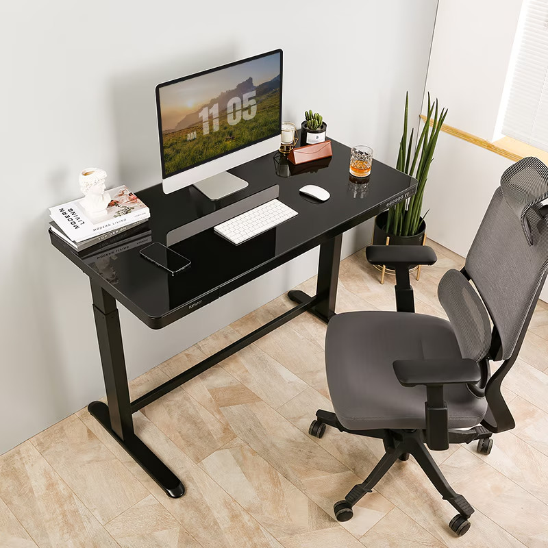 A FlexiSpot Comhar Glass All-in-One elektromos állítható íróasztal elegáns, 120 × 60 cm-es üveglappal és masszív acél vázzal készül. A 72–121 cm között állítható magasság és a 4 memóriafokozat egyszerűvé teszi a testreszabást. A beépített USB-portok (2×A, 1×C), valamint a rejtett fiók segítenek a rendezettség és ergonómia fenntartásában.