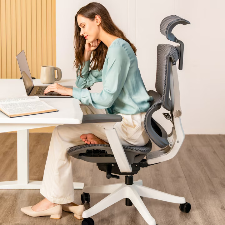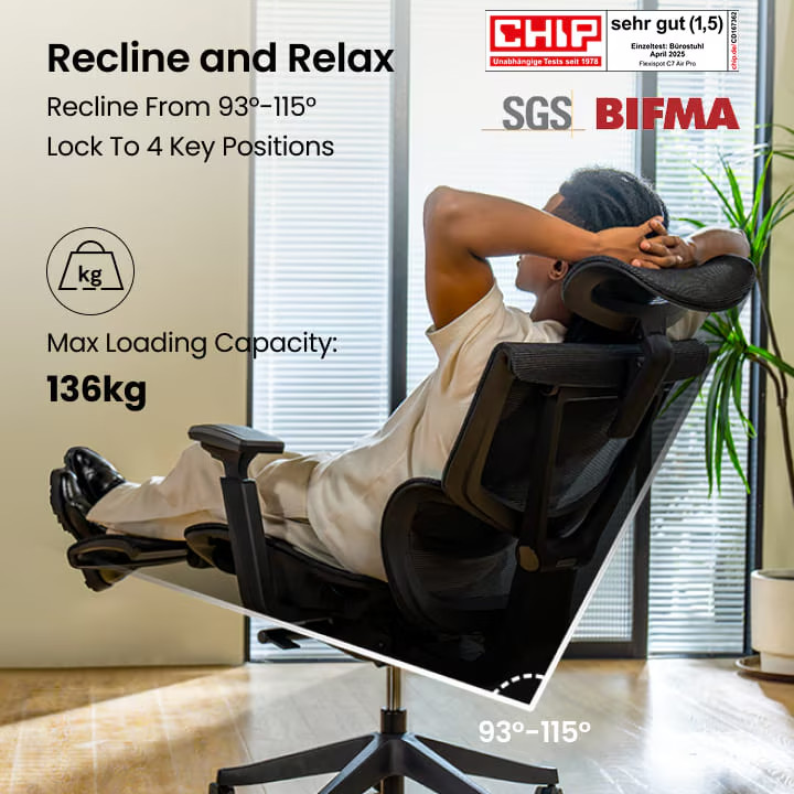 Prémium ergonomikus irodai szék C7, Hálós ülőfelület kihúzható lábtartóval, Fekete – adaptív deréktámasz, állítható fejtámla és kartámasz, hosszú távú ülőmunkához