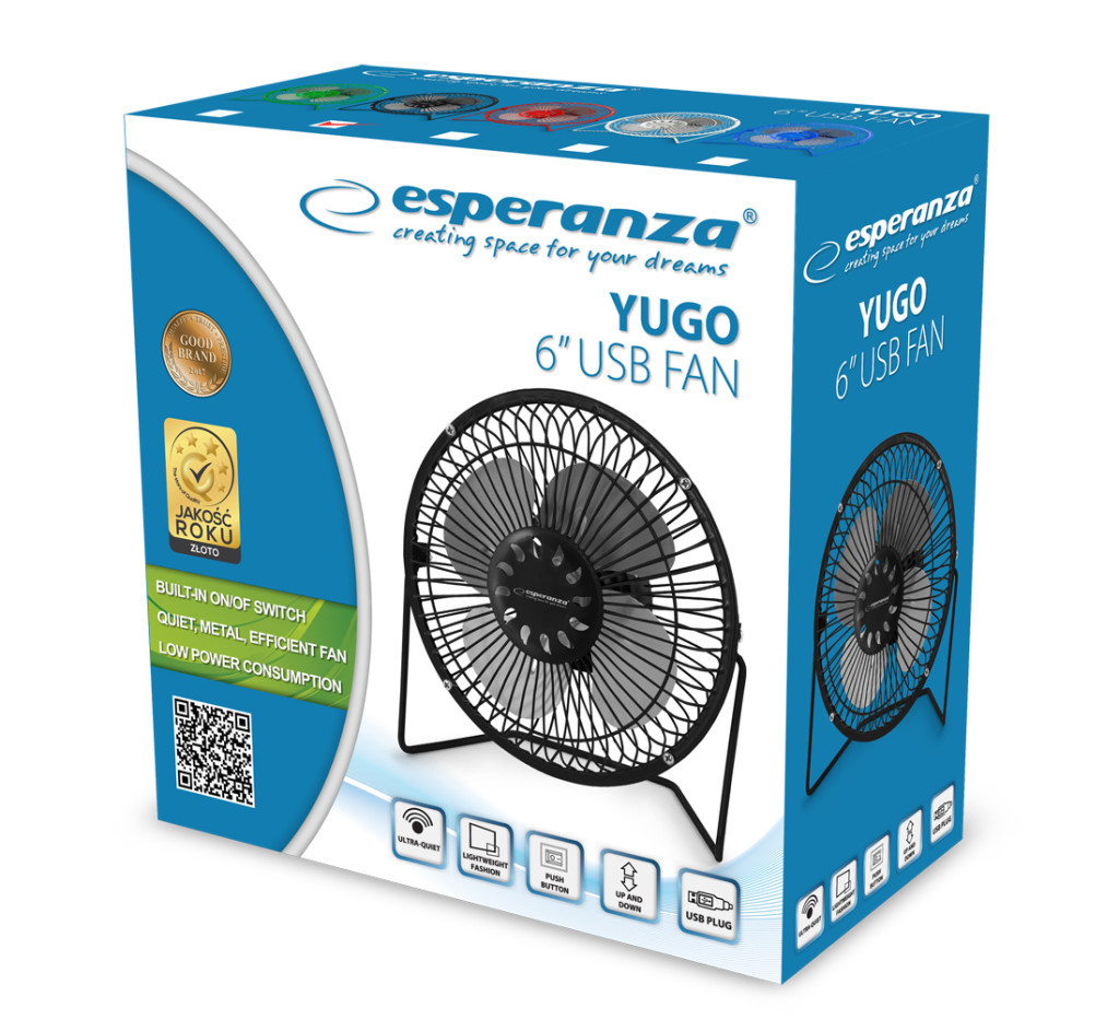 A Esperanza YUGO ventilátor hordozható és hatékony hűtési megoldás, amely USB-porton keresztül működik. Könnyedén csatlakoztatható számítógéphez, USB-töltőhöz vagy power bankhoz, így számos helyzetben használható. A fém ventilátorlapátok tartósságot és sérülésállóságot biztosítanak. Beépített be-/kikapcsoló gombbal rendelkezik, így nem szükséges minden használat után lecsatlakoztatni. Az állítható dőlésszög lehetővé teszi a levegőáramlás igény szerinti irányítását, a stabil talp gumírozott rezgéscsillapítókkal van ellátva a nagyobb stabilitás érdekében.